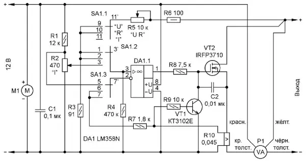 Резистор R10 - токоизмерительный. При максимальном токе 10 А падение напряжения на нём равно 0,45 В. В соответствии с типовыми характеристиками транзистора IВЕР3710 для обеспечения тока стока 10 А при напряжении на затворе относительно истока около 6 В и максимальной рабочей температуре необходимо иметь напряжение сток-исток не менее 0,5 В, поэтому минимальное напряжение между выходными контактами устройства, при котором поддерживается стабилизированный выходной ток 10 А, равно около 1 В. При меньшем токе напряжение пропорционально меньше.