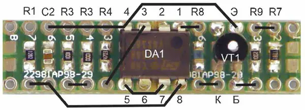 Мелкие радиоэлементы - ОУ, остальные резисторы, кроме R6, конденсатор С1, транзистор VT1 - установлены на двух неразделённых печатных платах размерами 10,5x20,5 мм, приобретённых в интернет-магазине. На каждой плате на расстоянии 7,62 мм друг от друга выполнены два ряда по восемь металлизированных отверстий с шагом 2,54 мм и пары контактов для элементов, предназначенных для поверхностного монтажа. На рис. 5 приведена фотография с установленными элементами до распайки перемычек и разметка их установки. Перемычка между выводами 5 и 7 микросхемы DA1 служит для установки неиспользуемого второго ОУ в корпусе микросхемы в устойчивое состояние.