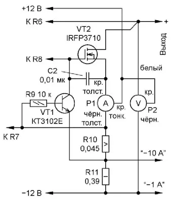 В режиме стабилизированного напряжения токоизмерительный резистор R11 не несёт полезной нагрузки, поэтому в этом режиме подключать устройство к проверяемому источнику следует через контакты "+" и "-10 А".