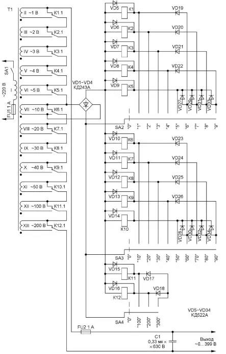Схема предлагаемого устройства показана на рис. 1. Основа его - сетевой трансформатор Т1 с одной первичной (I) и двенадцатью вторичными обмотками (II-XIIl). Каждая вторичная обмотка может быть включена или не включена в выходную цепь контактами соответствующего реле, как и в устройстве [3]. Обмотки реле K1-K12 получают питание от одной из вторичных обмоток (VII) трансформатора Т1 через диодный мост VD1-VD4. Диоды VD5- VD16 подключены к обмоткам реле с целью подавления импульсов ЭДС самоиндукции при прерывании тока через обмотки. Но отличие предлагаемого устройства в том, что ряд значений напряжения вторичных обмоток выбран другим, а для управления реле использованы переключатели SA2- SA4 и дешифраторы на диодах VD17- VD34, что позволило получить наглядную индикацию значения выходного напряжения по положению переключателей .