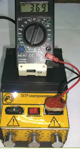 Внешний вид предлагаемого устройства показан на рис. 3. Видно, что при положениях переключателей 392 В вольтметр показывает 369 В. Это произошло от того, что в момент фотографирования в сети было пониженное напряжение. И лишь при номинальном сетевом напряжении 220 В показания мультиметра и переключателей совпадут. Эта особенность характерна и для упомянутых выше конструкций [1-3].