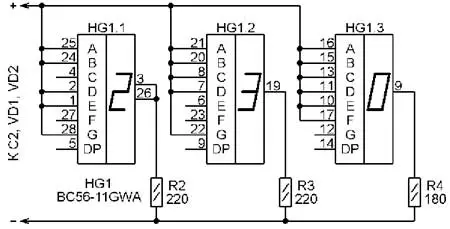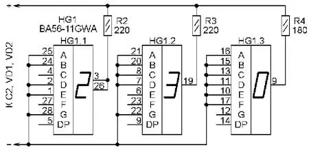 Вместо платы с индикатором тактовой частоты от старого компьютера, если её найти не удалось, можно использовать любой светодиодный трёхразрядный семиэлементный индикатор, разряды которого имеют раздельные выводы элементов (общее число выводов таких индикаторов - 28). Индикатор с общими анодами разрядов включают по схеме, изображённой на рис. 2, а с общими катодами - на рис. 3. Конечно, можно применить и три одноразрядных индикатора или четырёхразрядный, не использовав в нём один разряд. Подбирая резисторы R2-R4, устанавливают желаемую яркость свечения цифр.