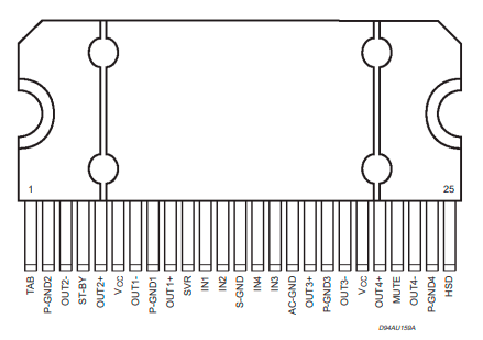 Данная микросхема представляет собой мостовой УМЗЧ класса AB, поддерживающий работу одновременно с четырьмя каналами звука.