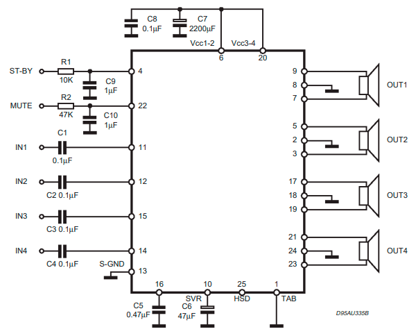 Производитель приводит одну схему, подходящую как для тестирования микросхемы, так и для реализации полноценного четырёхканального усилителя. Она ниже.