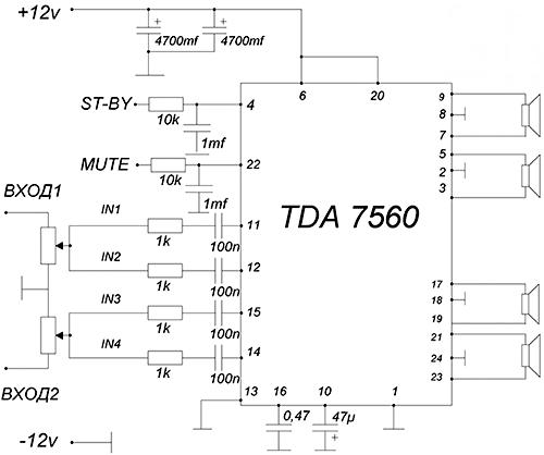 Рис. 2. Типовая схема реализации усилителя на TDA 7560