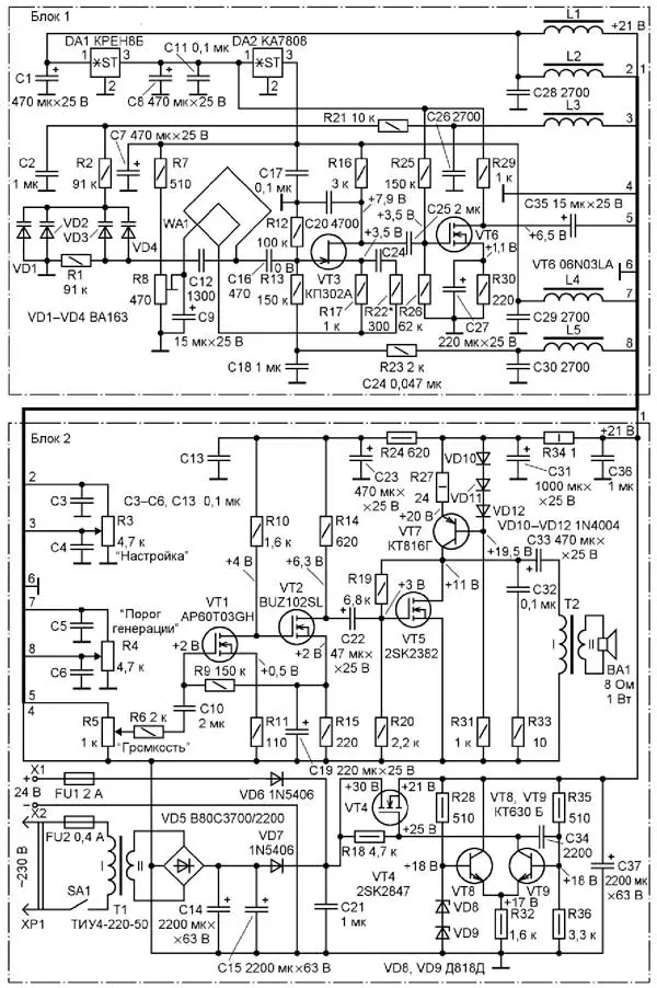 Второй блок содержит усилитель мощности ЗЧ на четырёх транзисторах, переменные резисторы управления R3-R5 и сетевой источник питания с понижающим трасформатором Т1, мостовым выпрямителем VD5 и стабилизатором напряжения на транзисторах VT4, VT8, VT9.
