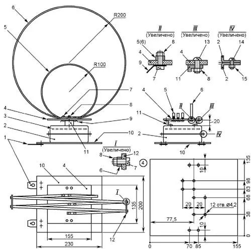 Конструкция блока 1 показана на рис. 2. Детали его электронной части смонтированы на печатной плате 3, помещённой в металлический короб, образованный двумя одинаковыми полыми деталями 2 квадратной формы (одна с другой они соединены винтами 14 с гайками 15). Нижняя (по рисунку) деталь короба привинчена шурупами к основанию 10 (пластина ламинированного напольного покрытия толщиной 6 мм), верхняя (винтами 13 с гайками 8) - к стойкам 11 (профиль зетовый равнополочный), на которых с стеклотекстолитовая панель 4 с рамочной антенной. Последняя содержит три витка алюминиевой шины 8x4: первые два (6) - диаметром 400, а третий (5) - 200 мм. Для фиксации взаимного положения витков большого диаметра применены стеклотекстолитовые планки 12, прикреплённые к ним винтами 7 с гайками 8.
