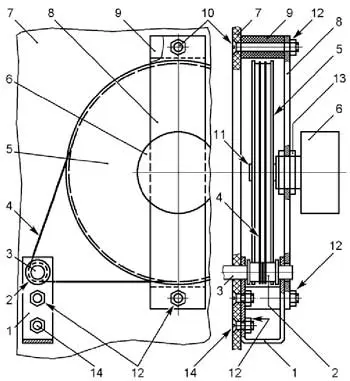 Возможная конструкция такого верньера представлена на рис. 4. Здесь 1 - закреплённая на передней панели приёмника 7 винтами 14 с гайками 12 металлическая скоба 1, в отверстиях которой вращается валик настройки 3 с малым шкивом 2. Большой шкив 5 закреплён стопорным винтом на валике 11 переменного резистора настройки 6 (R3). Последний закреплён гайками 13 в отверстии пластины 8, которая, в свою очередь, закреплена с помощью стоек 9 и винтов 10 с гайками 12 на передней панели 7. Вращение от малого шкива к большому передаётся тросиком 4, в качестве которого применена капроновая рыболовная леска.