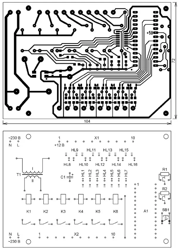 Рис. 10. Чертёж печатной платы и схема расположения выводных элементов