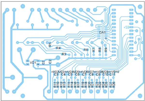 Все вышеперечисленные компоненты смонтированы на печатной плате размерами 104х72 мм из фольгированного с одной стороны текстолита толщиной 1 мм. Элементы для поверхностного монтажа устанавливают со стороны печатных проводников. Чертёж печатной платы и схема расположения выводных элементов показаны на рис. 10. На плате есть одна перемычка. Схема расположения элементов для поверхностного монтажа приведена на рис. 11. Плата разрабатывалась под изготовление методом лазерно-утюжной технологии.