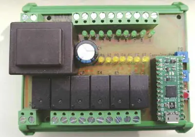 Светодиоды входных цепей HL8-HL16 зелёного свечения L-934SGD, также диаметром 3 мм. Плату микроконтроллера с напаянными штыревыми разъёмами вставляют в два 14-контактных гнезда PBS-14, которые запаивают на плату контроллера. Для подключения контроллера к внешним цепям на плату установлены 12 двухконтактных винтовых клеммников DG300-5.0-02P-14-00AH. Для монтажа платы контроллера на DIN-рейку понадобится открытый корпус Sanhe 23-59 [3].