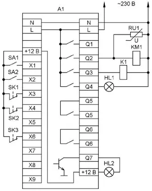 Пример схемы внешних соединений представлен на рис. 15. Питание контроллера 230 В подаётся на любую пару контактов разъёмов в верхней или нижней части платы контроллера. Входы 14 представляют собой "сухие" контакты выключателей и контактных датчиков.