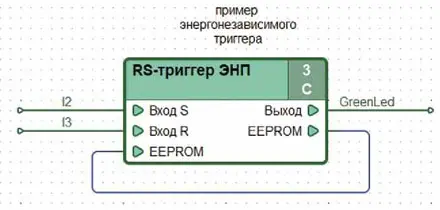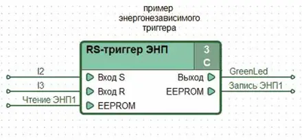 Блок 3 - это пример реализации энергонезависимого триггера, см. рис. 5. Лог. 1 на входе I2 триггер включается и включает светодиод зелёного свечения на плате микроконтроллера, лог. 1 на входе I3 отключает триггер и гасит светодиод. Подавлять дребезг для входов триггера не нужно. Состояние триггера сохраняется и после выключения питания. Если в вашей конструкции предполагается использовать больше энергонезависимых элементов, тогда нужно дополнить число регистров чтения и установки энергонезависимой памяти в рамке. Интервал адресов ячеек - от 0 до 63. Ячейки состоят из двух байтов, поэтому в них можно сохранять не только битовые значения, но и числовые от 0 до 65535 (0-FFFF).