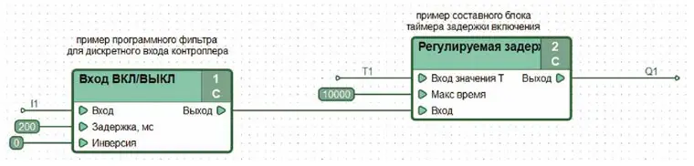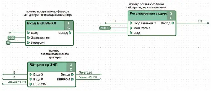 В файле "Конфигурациями" приведены примеры блоков, обеспечивающих простейшие алгоритмы, они находятся вне рамки, и их можно удалять и редактировать (рис. 9). Блоки 1 и 2 выполняют функцию включения выхода Q1 от входа |1 с регулируемой задержкой включения резистором Т1 (R1) в интервале 0...10 с. Дополнительно есть задержка по дребезгу в 0,2 с.