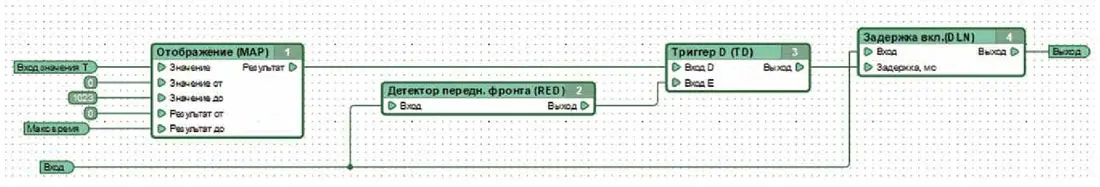 4.Для внешнего регулирования выдержки времени используются подстроечные резисторы R1 и R2. Для подключения их к таймерам лучше использовать составной блок задержки включения из примера в файле "Конфигурация.cfd", блок 2 на рис. 7. Внутренняя схема блока 2 показана на рис. 8. Причина - значение, считанное с аналогового входа, немного меняется с каждым циклом опроса программой, и если подавать его непосредственно на вход, отвечающий за выдержку времени таймера вместо константы, то это приведёт к некорректной работе таймера в период отсчёта времени. Особенно это заметно на малых значениях входного аналогового сигнала. Поэтому по приходу положительного фронта на вход запуска таймера отмасштабированное значение с аналогового входа блоком 1 будет зафиксировано в триггере 3 и не будет меняться до следующего цикла запуска таймера 4. Блок 2 детектирует фронт сигнала - на его выходе появляется кратковременный импульс лог. 1, который разрешает запись значения выдержки времени в триггер 3. Для формирования других типов временных задержек можно модифицировать этот блок. Для формирования задержки на отключение надо заменить блок 2 на детектор спада импульса, а таймер 4 - на задержку отключения.