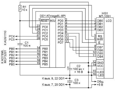 Для экспериментов с различными внешними АЦП был изготовлен по схеме, изображённой на рис. 1, модуль, содержащий микроконтроллер ATmega8L-8PI и буквенно-цифровой ЖКИ MT-10S1, позволяющий отобразить на своём экране строку из десяти символов. К этому модулю подключались для исследования различные микросхемы АЦП, для работы с каждой из которых в программную память микроконтроллера загружалась специально разработанная демонстрационная программа, превращающая устройство в простой цифровой милливольтметр постоянного тока.