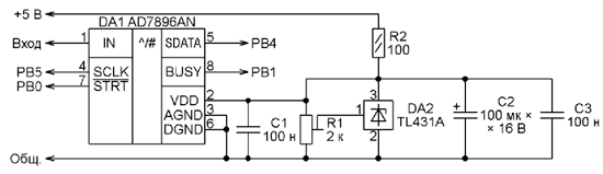 Точное значение напряжения питания устанавливают подстроечным резистором R1. Результат преобразования поступает в микроконтроллер по последовательному интерфейсу, образованному линиями PB5 (SCK) и PB4 (MISO). Микроконтроллер подаёт АЦП команду запуска преобразования по линии PB0 и принимает сигнал о его завершении по линии PB1.