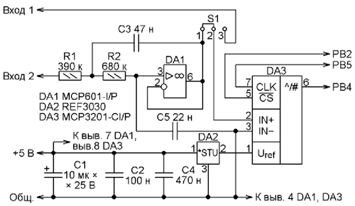 Если перемычка S1 установлена в положение 2-3, входное напряжение поступает на вход АЦП напрямую с Входа 1. Когда она в положении 1 -2, напряжение на вход АЦП проходит с Входа 2 через ФНЧ с частотой среза 10 Гци коэффициентом передачи 1 на ОУ DA1. Устанавливать на входе АЦП фильтр или повторитель напряжения на ОУ рекомендуется, если источник сигнала "шумит" или имеет высокое выходное сопротивление.