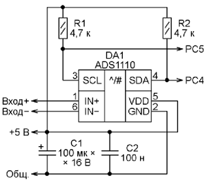 Наиболее просто подключить к микроконтроллерному модулю 16-разрядный АЦП ADS1110 [3]. Для этого требуются всего два резистора, два конденсатора и две линии ввода/вывода микроконтроллера. Схема подключения показана на рис. 4. АЦП имеет интерфейс I2C, аппаратный адаптер которого имеется в большинстве микроконтроллеров. Адрес ведомого АЦП ADS1110 на шине I2C зашифрован в нанесённой на корпус микросхемы маркировке. Всего возможны восемь вариантов: ED0 - 1001000, ED1 - 1001001... ED7 - 1001111. Если в разрабатываемом устройстве предполагается использовать несколько таких АЦП, нужно выбирать их с разными адресами ведомого.