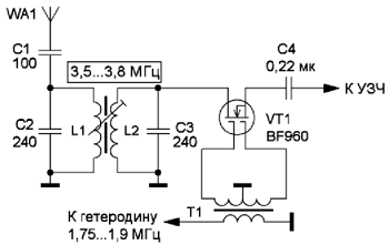 Сигналы диапазона 80 метров выделяет двухконтурный фильтр L1C2L2C3. Так как межэлектродные ёмкости транзистора малы, оказалось возможным его непосредственное подключение ко второму контуру. Сток и исток можно поменять местами, без заметного ухудшения качества приёма.