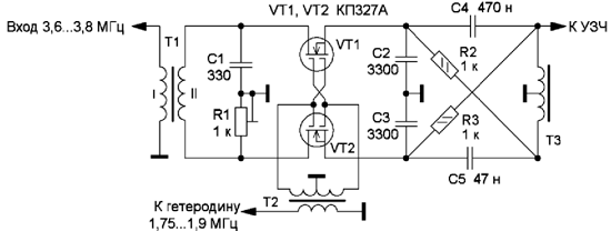 Схема смесителя диапазона 80 метров на одном транзисторе показана на рис. 1. Здесь гетеродин работает на частоте, вдвое меньшей принимаемой. Это позволило существенно ослабить излучение сигнала гетеродина (до 80 дБ) и практически избавиться от фона переменного тока, обусловленного таким излучением. Без УВЧ чувствительность приёмника с таким смесителем может достигать 0,3 мкВ. Динамический диапазон приёмника - около 100 дБ. Мощность сигнала гетеродина при этом невелика, смеситель начинает работать при напряжении сигнала гетеродина 0,3 В.