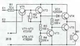 Сквозной ток через транзисторы VT4 и VT5 в моменты переключения отсутствует благодаря тому, что транзистор VT3 открывается, a VT5 закрывается при меньшем напряжении на эмиттере транзистора VT2, чем необходимо (с учетом диода VD1) для открывания транзистора VT4. Диод VD1 нужен и для исключения проникновения ЭДС обесточенного, но вращающегося по инерции электродвигателя на другие элементы регулятора.