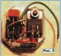 Узел управления смонтирован на алюминиевой пластине толщиной 4 мм, как показано на рис. 3. Прежде всего к пластине крепят транзисторы VT4 и VT5, причем последний — через изолирующую прокладку. Остальные элементы припаивают к выводам этих транзисторов. Транзисторы КТ829В могут быть заменены на КТ829 с другими буквенными индексами. Транзисторы КТ315Г должны иметь как можно меньший обратный ток коллектора, вместо них можно применить КТ315А или КТ315В. Диод — любой из серий КД521, КД522. Собранный узел приклеивают к торцу двигателя двусторонней липкой лентой, обеспечивая этим и электрическую изоляцию между корпусом двигателя и основанием узла.