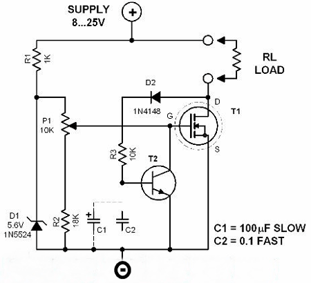 Если ваша схема питается током до 5 А и напряжением до 25 В, то вам определенно понравится схема ниже. Порог срабатывания может быть настроен подстроечным резистором, а время реакции можно задать с помощью конденсатора.