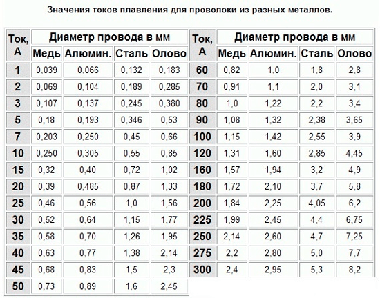 Ввиду того, что плавкость зависит от множества факторов (диаметр проволоки, теплоотводящая способность окружающей среды, материал, из которого изготовлена проволока, и т.п.), то чаще всего сгоревший элемент меняют согласно готовым расчетам из таблицы ниже (для наиболее популярных металлов).