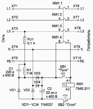 Для отключения потребителя от сети надо кратковременно нажать на кнопку SB2. Следует помнить, что при пропадании напряжения сети и последующем его появлении пускатель автоматически не сработает, требуется кратковременно нажать на кнопку SB1 "Пуск".