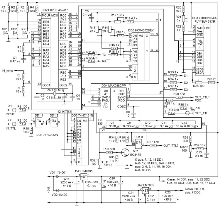 Кнопки SB1-SB3 подключены к МК и используются для управления прибором. Резисторы R1-R4 задают высокий уровень на входах МК. На микросхеме DD3 (74HC151N) [6] собран коммутатор входов генератора. Коммутатором управляет МК двоичным кодом с портов RA2 и RD2. Конденсаторы C6- C12 - времязадающие генератора. Коммутацией конденсаторов управляет МК с портов RB4, RD3-RD7. На микросхеме DD1 (74HC132N) [7] собран формирователь фронтов измеряемого сигнала. На микросхеме DD5 (HCF4052BEY) [8] и резисторах R13- R19 собран коммутатор вида модуляции генератора. Резистором R17 регулируют частоту генератора "грубо". Резистором R13 регулируют частоту генератора "плавно". Резистором R14 регулируют скважность импульсов. Сдвоенным резистором R32 плавно регулируют напряжение на выходе OUT генератора.