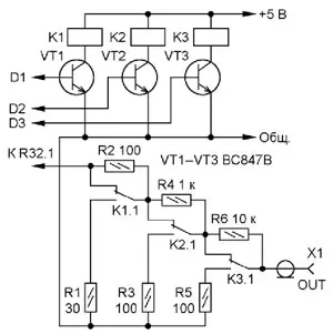 Резисторы R1-R6 образуют делитель выходного напряжения. Транзисторы VT1-VT3 подают напряжение на реле K1-K3. Транзисторами управляет МК. Применены реле AXICOM SWISS FP2 D3009(K1-K3) [9]. Их можно заменить на реле РЭС60 исполнения РС4.569.435-03 или РС4.569.435-08. Но у РЭС60 ток в пять раз больше - около 100 мА.