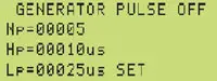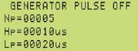 -нажатием на кнопку START выбирают параметр, который необходимо установить (Np - число импульсов в пакете, Hp - длительность импульса в микросекундах и Lp - длительность паузы между импульсами в микросекундах). Рядом с выбранным параметром индицируется надпись SET;