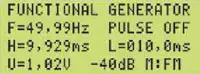 Нажатием на кнопку RANGE выбирают функцию FUNCTIONAL GENERATOR (рис. 12). Нажатием на кнопку SETTING устанавливают необходимый тип модуляции, например HM (рис. 13). Нажатием на кнопку START включают генератор (рис. 14, рис. 15). Нажатием на кнопку RANGE (при включённом генераторе) выбирают необходимый частотный диапазон. Нажатием на кнопку SETTING (при включённом генераторе) выбирают необходимую форму сигнала на выходе генератора.