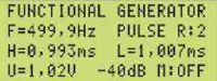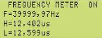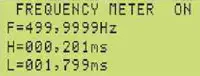 При измерении параметров цифрового TTL-сигнала кнопкой RANGE выбирают функцию FREQUENCY METER (рис. 16). Индикация низкочастотного сигнала (в данном случае F=500 Гц и скважность 10) имеет вид, приведённый на рис. 17. Индикация при F=40 кГц и скважности 2 имеет вид, показанный на рис. 18.