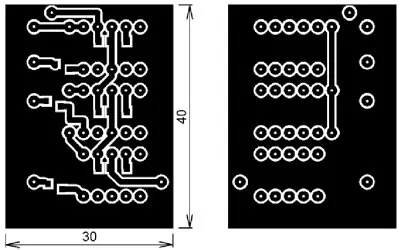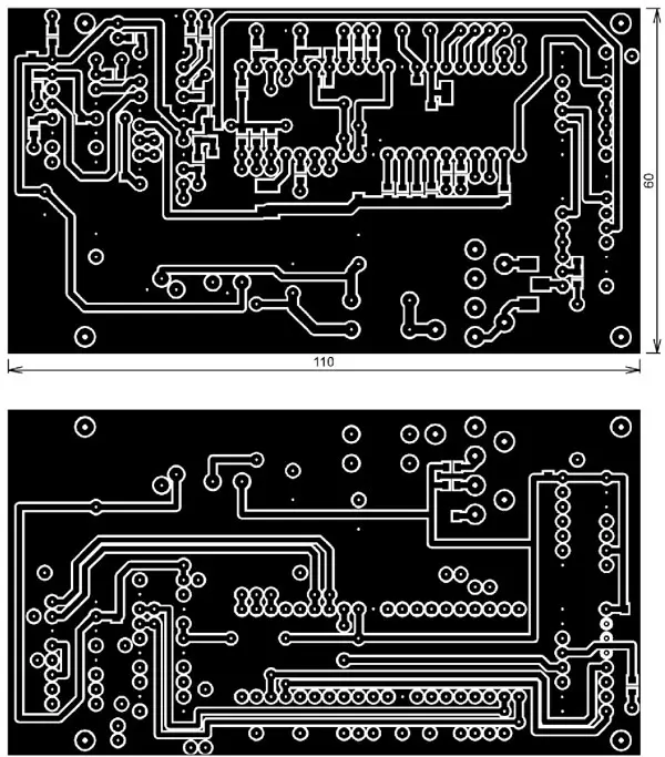 Устройство собрано на печатной плате из фольгированного с двух сторон стеклотекстолита толщиной 1 мм. Чертёж платы показан на рис. 21, расположение элементов - на рис. 22. На одной стороне размещены все микросхемы, диоды, оксидные конденсаторы С14, С20, С21, С23, блокировочные конденсаторы С15, С16, С22, подстроечные резисторы и резисторы R20, R22, R26. Остальные детали расположены на противоположной стороне. В отверстия, обозначенные чёрными точками, вставляют отрезки лужёного провода и припаивают их с обеих сторон платы. LCD-индикатор прикрепляют к плате четырьмя винтами М3. В генераторе применены переменные резисторы 16K1-B20K-L15KC (R13, R14), 16K1-B100K-L15KC (R17), 16K2-B100-L15KC (R32), подстроечные - SH-655MCL (R21, R25), подстроечный конденсатор TZC3P300A110R00 (С3), оксидные конденсаторы Hitano EHP (С14, С20, С21, С23), танталовый конденсатор для поверхностного монтажа (С12), остальные резисторы и конденсаторы - для поверхностного монтажа типоразмера 0805. Кварцевый резонатор ZQ1 - HC49S, кнопки - TS-A3PG-130, разъёмы - 24_BNC-50-2-20/133_NE. МК запрограммирован программатором ChipProg-40. МК установлен в панель DIP40, микросхема MAX038 также установлена в панель DIP20.
