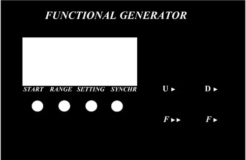 Прибор размещён в пластмассовом ко рпусе Z-33. Переднюю фальшпанель, эскиз которой показан на рис. 25, распечатывают на лазерном принтере, лезвием вырезают прямоугольник размерами 90x40 мм для экрана ЖКИ. Далее ламинируют и в ы резают фальшпанель размерами 170x115 мм. Приклеивают фальшпанель к ко р пусу цианоакрилатным клеем. Сверлят четыре отверстия диаметром 3 мм под кнопки. Кнопки устанавливают на фольгированном стеклотекстолите толщиной 1,5 мм и размерами 100x12 мм, который закрепляют в корпусе двумя винтами М3 по краям. Между платой с кнопками и корпусом на винты устанавливают алюминиевые втулки. Длина втулки определяется из расчёта, чтобы шток кнопки выступал на 0,5...1 мм над поверхностью корпуса. Кнопка SYNCHR в этом варианте устройства не используется. Она предназначена для дальнейшей модификации.