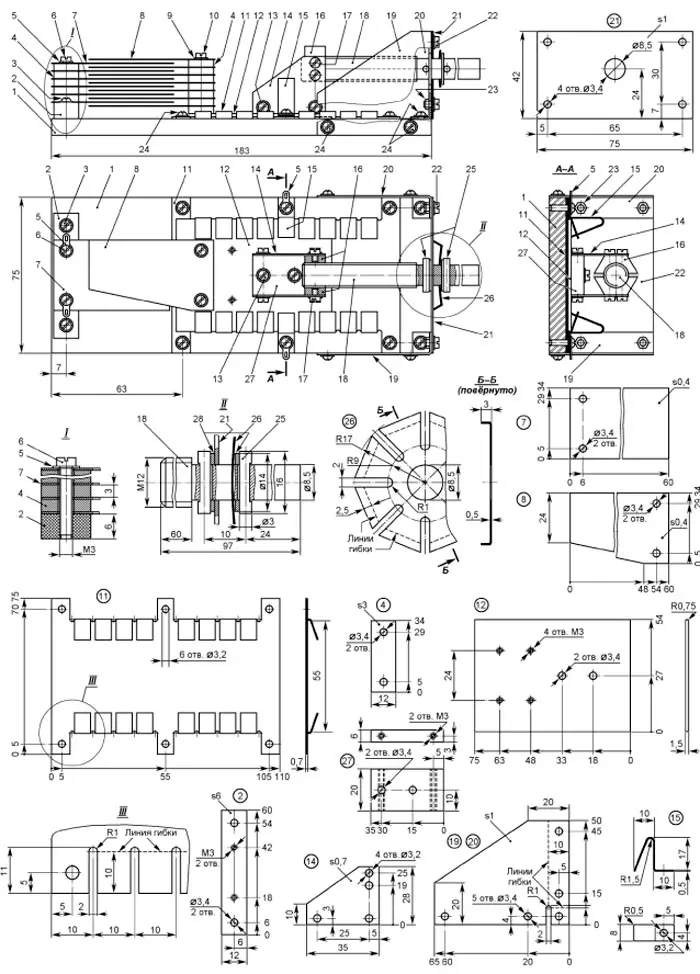 Направляющую 11 и ползун 12 изготавливают в такой последовательности. Заготовку первой размерами 110×75 мм из листовой стали толщиной 0,7 мм вырезают с таким расчётом, чтобы направление проката было перпендикулярно её длинной стороне. Затем в ней по разметке сверлят шесть отверстий диаметром 3,2 мм и 20 отверстий диаметром 2 мм (с центрами в местах пересечений линий гибки с осевыми линиями, следующими с шагом 10 мм). Далее ко всем отверстиям малого диаметра пропиливают ножовкой по металлу пазы, формируя таким образом четыре группы лепестков, подлежащих изгибанию для образования канала движения ползуна 12. Удалив надфилем заусенцы с кромок пазов, накладывают на заготовку направляющей заготовку ползуна (латунную пластину толщиной 1,5 мм со всеми необходимыми отверстиями) и скрепляют их сгибанием четырёх крайних лепестков направляющей. Остальные сгибают, сдавливая их плоскогубцами. После этого заготовку ползуна извлекают из направляющей, выбивая её с помощью деревянного клина и молотка. В завершение, аккуратно скругляя кромки ползуна личным напильником, добиваются его лёгкого, но без люфта, движения в направляющей.