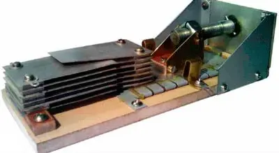 Вотличие от КПЕ традиционной конструкции, в которых изменение ёмкости происходит путём вращения роторных пластин в зазорах статорных, в предлагаемом устройстве подвижные пластины перемещаются в зазорах между статорными при поступательном движении, осуществляемом с помощью передачи винт-гайка. Изменение ёмкости от минимального до максимального значения происходит за 22 оборота ходового винта. Конструктивно этот КПЕ немного сложнее традиционных и имеет несколько большие размеры, но обладает и рядом преимуществ по сравнению с ними: его блоки подвижных и неподвижных пластин и их детали легко заменяемы (это может понадобиться, например, при экспериментах по изменению граничных значений ёмкости или функциональной характеристики КПЕ - зависимости ёмкости от величины перемещения пластин), для него не нужно изготавливать специальный верньерный механизм (он входит в его состав), упрощается шкальное устройство. Замена блоков неподвижных и подвижных пластин соответственно расположенной горизонтально катушкой индуктивности и магнитопрово- дом превращает устройство в ферровариометр.