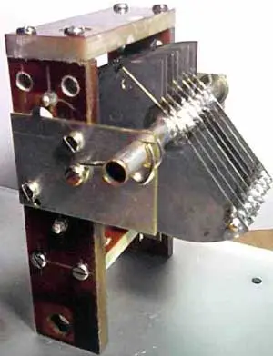 Завершают сборку установкой на место винтов-ограничителей 4 и 9. Первым фиксируют ротор в положении, соответствующем минимальной ёмкости КПЕ, вторым - в положении, соответствующем его максимальной ёмкости. Положение самих винтов фиксируют гайками 3 (М3). Выступающие концы фиксаторов 12 аккуратно расклёпывают в отверстиях планок 16. Материалы деталей КПЕ и некоторые технологические указания по его сборке содержатся в подписи к рис. 1. Внешний вид одного из вариантов практической конструкции показан на рис. 2.