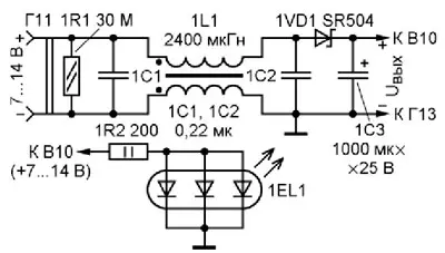 Кроме описанной, были сделаны ещё несколько доработок (рис. 3; позиционные обозначения новых элементов начинаются с префикса 1). Так, используемая для подсветки шкалы настройки лампа накаливания на 12 В (1,1 Вт), свечение которой при напряжении питания 9 В почти незаметно, заменена более ярким плоским матричным светодиодом 1EL1 белого свечения (применён светодиод от "фотовспышки-фонарика" мобильного телефонного аппарата). Для охлаждения к его выводам припаян небольшой теплоотвод из толстого многожильного медного монтажного провода. Токоограничивающий резистор 1R2 помещён в защитную резиновую трубку. Светодиод подключён таким образом, чтобы шкала подсвечивалась всё время, пока включено питание приёмника.
