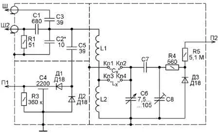 Суммарная ёмкость конденсаторов С2-С4 приставки должна быть в 100 и более раз больше максимальной ёмкости переменного конденсатора С6 (см. рис. 1). Чем она больше, тем точнее будут измерены индуктивность и добротность катушки. Чем меньше ёмкость конденсатора C1, тем меньшей будет нагрузка на генератор, но тем большее напряжение от него потребуется для значительного отклонения стрелки прибора Е4-11 при резонансе.