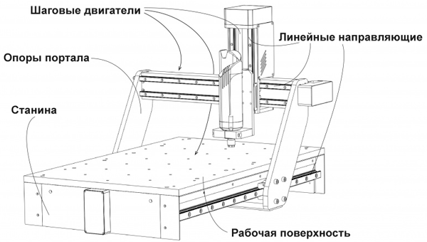 В качестве примера реализации можно взять готовый вариант ниже. Станина является своего рода опорой для подвижного портала (позиционирование по одной из осей) и рабочей поверхности, где будет располагаться обрабатываемая деталь (если деталь лёгкая, возможно необходимо будет подумать о её дополнительном креплении к основанию). Сама станина для исключения вибраций может крепиться к полу на анкера.