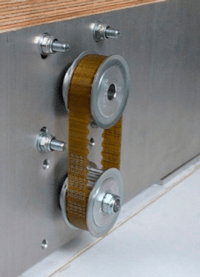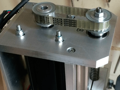 Чтобы преобразовать вращение двигателя в линейное движение, в данной конструкции было применено соединение винт-гайка + шкив. Выглядит это так.