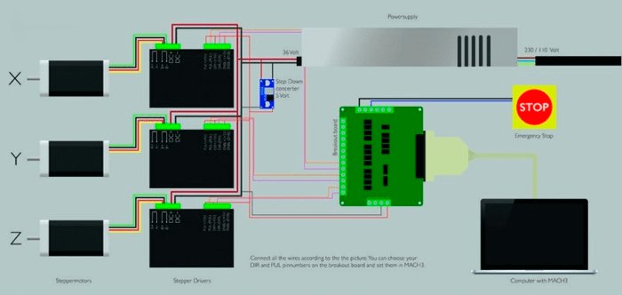 Здесь есть сами двигатели (использовались Nema 23), отвечающие за три оси (X, Y, Z), их драйверы (это не программа, а специальная плата управления), блок питания (для Nema требуется 36 В, для контроллера – 5 В), аварийный останов (на случай экстренного отключения двигателей) и интерфейсная плата (контроллер).