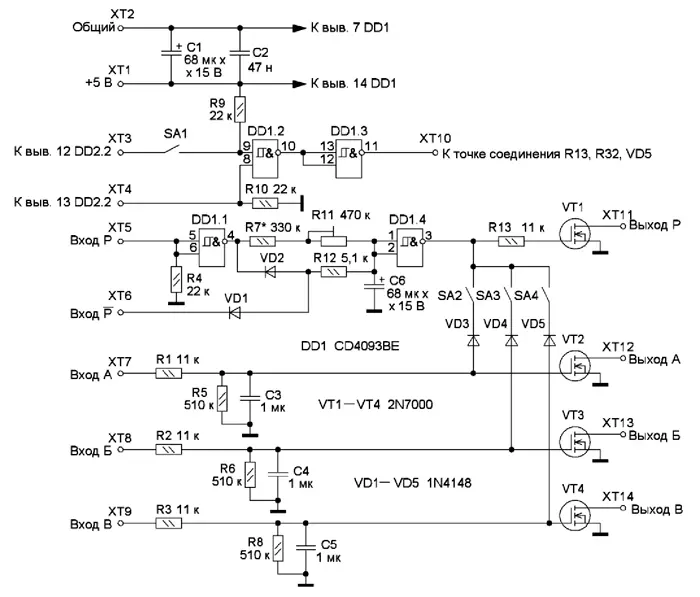 Если на входе разрешения (контакте ХТ5) установлен низкий уровень напряжения, конденсатор С6 заряжен и на выходе элемента DD1.4 присутствует низкий логический уровень, поэтому транзисторные ключи оказываются закрытыми вне зависимости от напряжения на их входах. При появлении на входе разрешения высокого логического уровня конденсатор С6 быстро разряжается через диод VD2 и резистор R12, ограничивающий разрядный ток, и на выходе элемента DD1.4 появляется высокий уровень напряжения, закрывающий диоды VD3-VD5 и разрешающий работу транзисторных ключей.