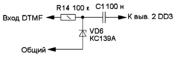 В устройство также добавлен третий вход DTMF-сигнала, схема которого приведена на рис. 2, и особых пояснений не требует. Дополнительный вход позволяет управлять устройством не только с помощью отдельного стационарного пульта-телефона, но и с помощью одного из телефонов, подключённых к устройству [2] (для этого дополнительный вход DTMF-сигнала соединяют с контактом А или Б этого устройства).