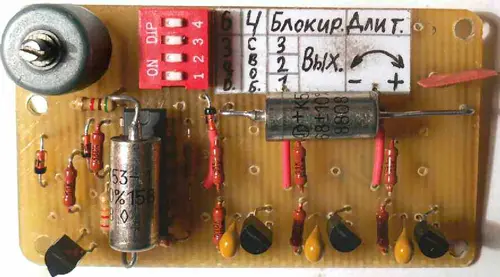 Собранный правильно и из исправных деталей модуль начинает работать сразу. Налаживание сводится к установке нужной длительности сигнала разрешения работы транзисторных ключей путём подбора сопротивления резистора R7 (минимальная длительность) и, при необходимости, сопротивления подстроечного резистора (максимальная длительность). При указанных на схеме номиналах элементов минимальная выдержка равна 15 с, а максимальная - 45 с. Для изменения длительности выдержки также можно подобрать ёмкость конденсатора С6, а если в плавном изменении выдержки нет необходимости, вместо подстроечного резистора следует установить перемычку.