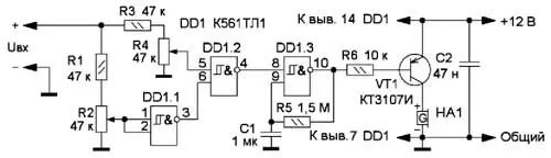 Возможные схемы построения узлов отключения звукового сигнала рассмотрим на примере индикатора выхода напряжения за установленные пределы, схема которого приведена на рис. 1. Работает этот индикатор следующим образом. Когда входное напряжение превышает порог, установленный переменным резистором R4, но меньше порога, установленного переменным резистором R2, на выходе элемента DD1.2 присутствует низкий логический уровень, запрещающий работу генератора, собранного на элементе DD1.3. На выходе этого элемента присутствует высокий логический уровень, поэтому транзистор VT1 закрыт и пьезоизлучатель со встроенным генератором НА1 отключён. При выходе входного напряжения за установленные переменными резисторами пределы на выходе элемента DD1.2 появляется высокий логический уровень, разрешающий работу генератора, и пьезоизлучатель НА1 начинает издавать звуковой сигнал, прерывающийся с частотой около 1 Гц.