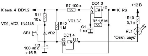 Построить узел отключения звукового сигнала без использования дополнительного транзистора можно по схеме, приведённой на рис. 3. В исходном состоянии на выходе элемента DD1.4 также присутствует высокий логический уровень, а конденсатор С3 разряжен. При появлении входного сигнала конденсатор С3 начинает заряжаться через резистор R12, но так как постоянная времени цепи R12C3 превышает период следования импульсов на выходе генератора, конденсатор С3 не успевает зарядиться до напряжения переключения элемента DD1.4, периодически разряжаясь через диод VD3 и выход элемента DD1.3. При нажатии на кнопку SB1 конденсатор С3 быстро заряжается через резистор R11, и в момент появления на выходе элемента DD1.3 высокого логического уровня (пауза в звуковом сигнале) на выходе элемента DD1.4 появляется низкий логический уровень, запрещающий работу генератора.